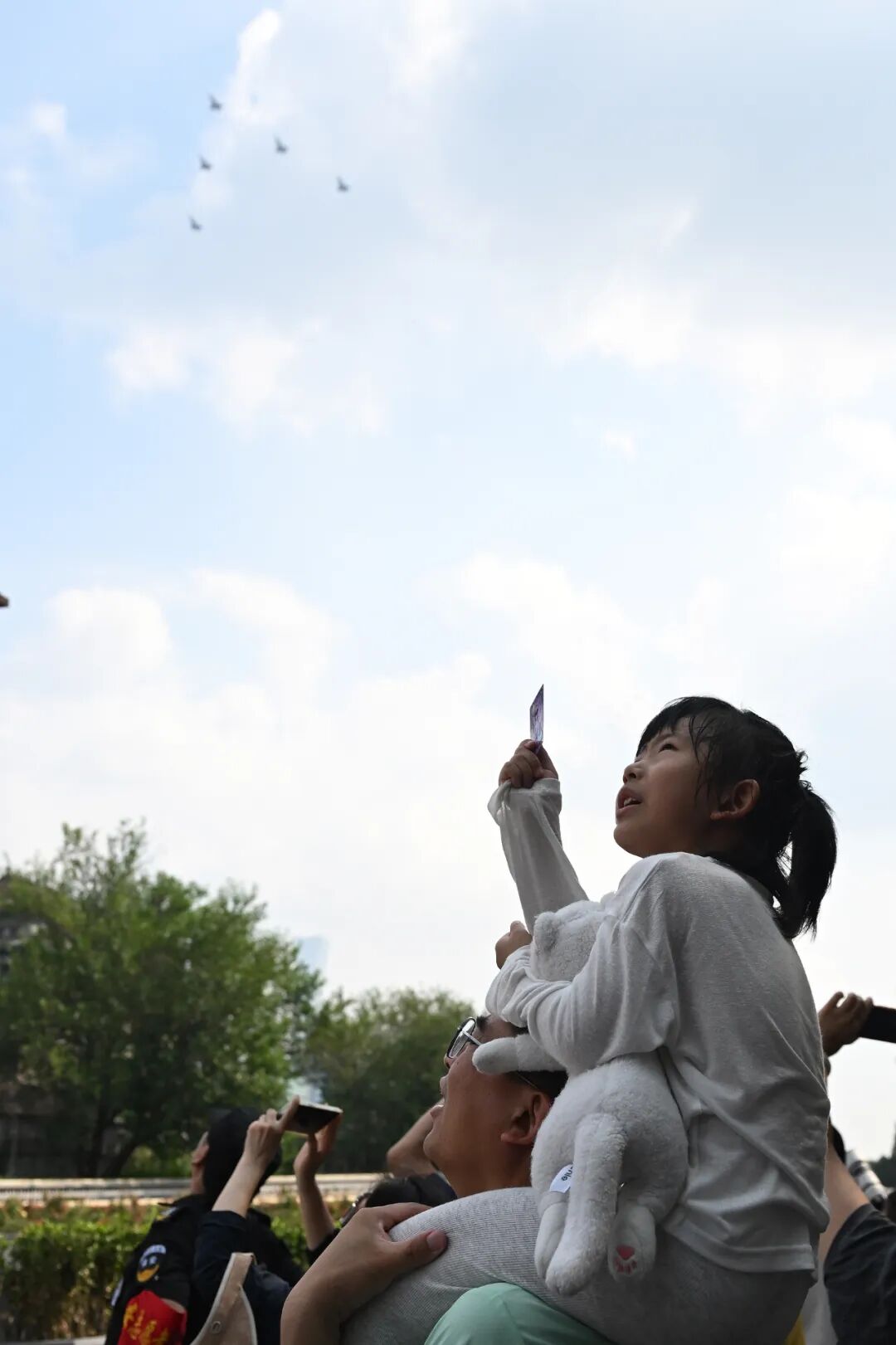 9月3日,纪念中国人民抗日战争暨世界反法西斯胜利战争八十周年大会在北京隆重举行。观众通过天安门广场观看空中护旗梯队。这是空中护旗梯队接受检阅。纪念中国人民抗日战争暨世界反法西斯战争胜利八十周年大会在北京隆重举行。纪念中国人民抗日战争暨世界反法西斯战争胜利八十周年大会在北京隆重举行。新华社记者肖艺九摄影